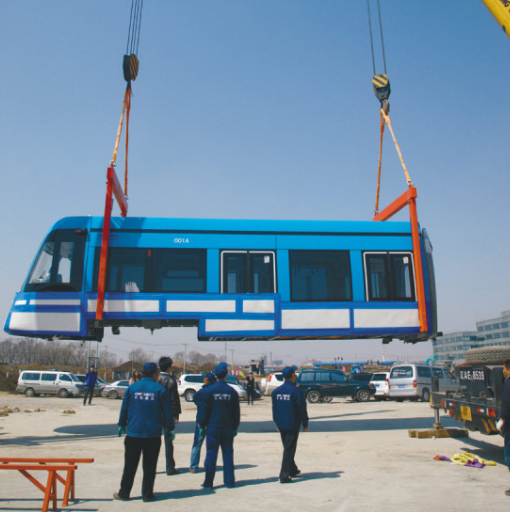 有轨电车是一种城市交通工具,其吊运通常需要使用到柔性吊装带,因为传统的钢丝绳吊运并不理想,首先钢丝绳的韧性不如柔性吊装带,再有就是钢丝绳本身硬度远远高于柔性吊装带,在吊运过程中容易对车身造成划伤,而柔性吊装带则不存在这种情况。